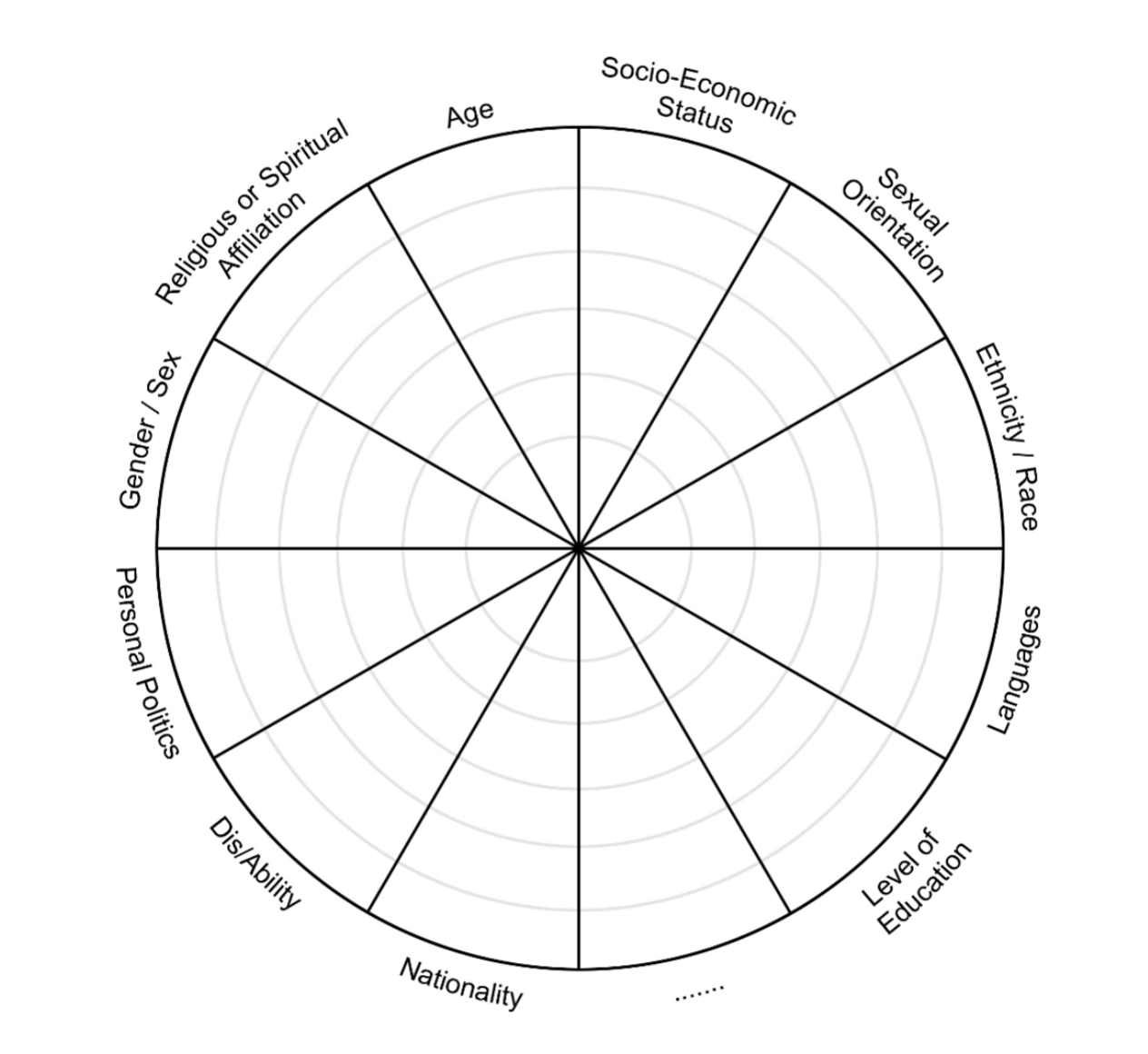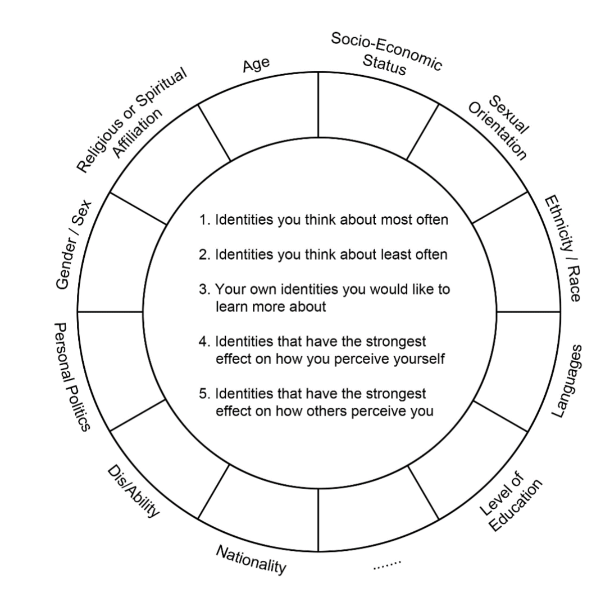 Het social identity wheel is bedoeld om na te denken over en te reflecteren op welke sociale identiteiten je kan vormen, wanneer deze expliciet zichtbaar en/of voelbaar worden, en hoe deze identiteiten in interacties met anderen vorm krijgen. Het research identity wheel daarentegen, gaat om nadenken over de verschillende en overeenkomstige sociale identiteiten van onderzoekers en participanten in onderzoekssettings en de rol hiervan in het proces van dataverzameling (interviews, focus-groepen, participerende observatie, etc.) en kennisproductie (zie bijlage Identity Wheels- 4).