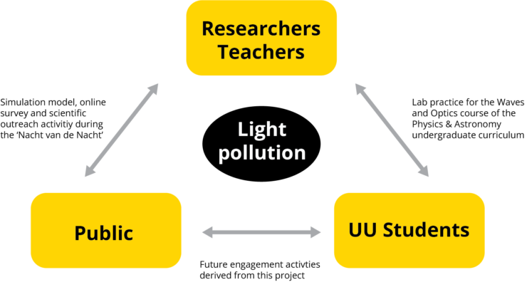 The goal of this project is to develop educational activities which raise awareness about light pollution and promote the development of possible solutions. These activities were designed within a three-way learning and working framework among university students, researchers/teachers, and the public, which can be found in the figure below.